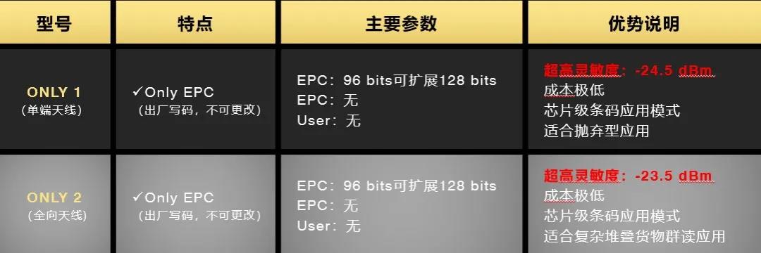 凱路威針對(duì)貨物面單和拋棄型標(biāo)簽研發(fā)的ONLY系列只讀芯片,靈敏度達(dá)到業(yè)界最高的-24.5dBm,成本達(dá)到業(yè)界最低,適用于各種復(fù)雜堆疊和快速群讀場(chǎng)景,是未來(lái)千億級(jí)郵包識(shí)別市場(chǎng)、萬(wàn)億級(jí)服裝和商品管理市場(chǎng)的最優(yōu)之選。